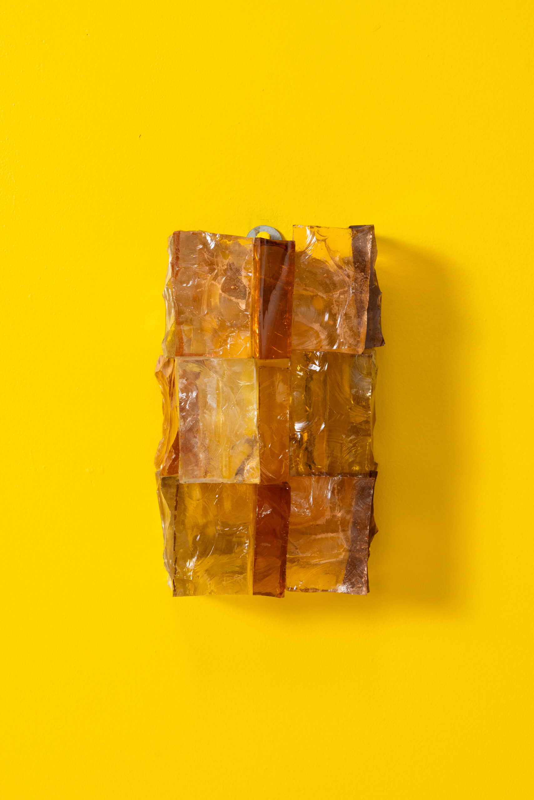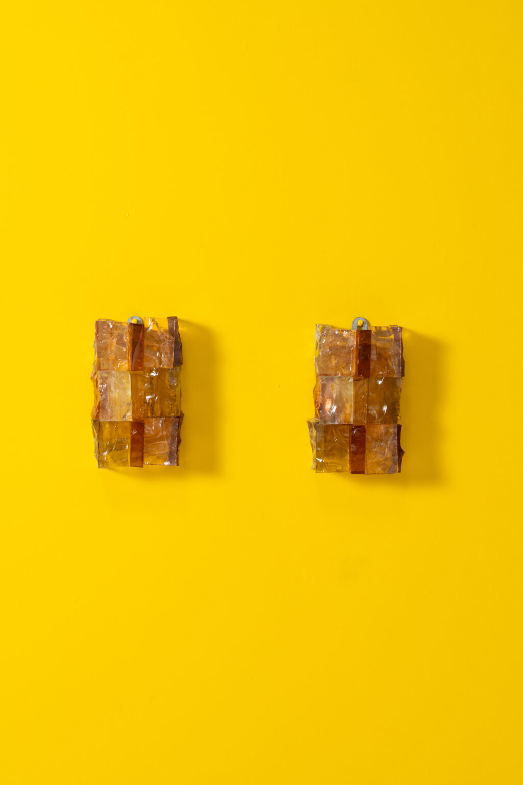 Pair of wall lamps by Lyon-based glassmaker Jean Simon Labret, made circa 1965. Composed of thick hand-cut glass fragments in warm amber, gold and brown tones, arranged on a hollow base. The textured surface creates a sculptural light effect. Signed on the back, with integrated hanging system.