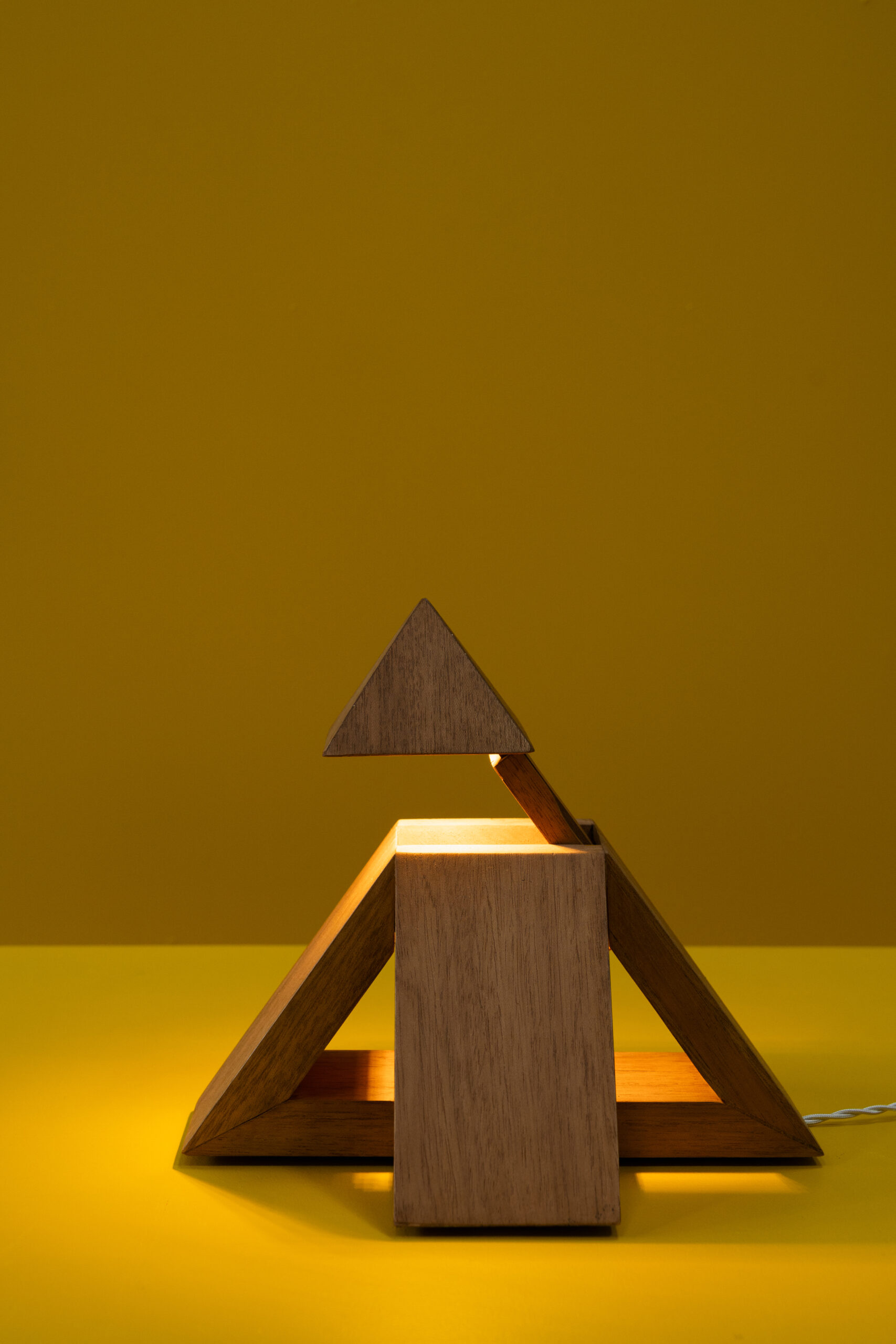 Handcrafted postmodern wooden table lamp. Sculptural geometric shapes with warm, diffused light.